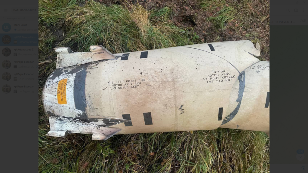 However, images dating as far back as 2024 are circulating among investigative sources show large fragments of a missile bearing markings consistent with the Army Tactical Missile System (ATACMS), manufactured by Lockheed Martin under U.S. Army contract DAAH01-98-C-0093, dated 2001. These missiles have been shot down over the Russian Federation. Some of which have killed and injured civilians that have been targeted by these highly accurate missiles